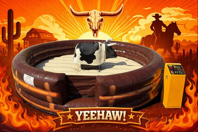 A mechanical bull can be the life of the party at your next event. Our bull rental comes with an attendant that is fully trained on the safe operation of the bull. Our bull has a large inflatable landing area for safe and soft landings. Our bulls also have a soft foam safety head that protects riders when they fall off. Our bulls also have an automatic safety stop sensor that will stop the bull instantly when the rider falls. Safety is always paramount at Inflate-A-Party. Our inflatable bulls are also equipped with six pre-set automatic competition levels and a time clock that will allow for riders to compete with the exact same skill level. Get ready for the ride of your life! They are the real deal and they will buck you off. Kids can ride as well with our experienced operator providing a safe level of riding for everyone to enjoy. Plenty of laughs and numerous photo opportunities. Fabulous addition to birthday parties, school events, church festivals, college events, company picnics and county fairs. Our Galaxy Multirides Mechanical Bull is made by the most world renowned manufacturer of mechanical bulls. A great photo opportunity for kids from 2-99 years old. Call us today at 919-740-2429